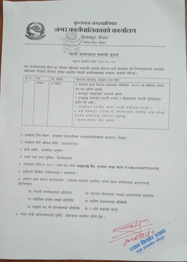 सेवा करारमा कर्मचारी र नगर प्रहरी पदपुर्ति गर्ने सम्बन्धी सूचना !