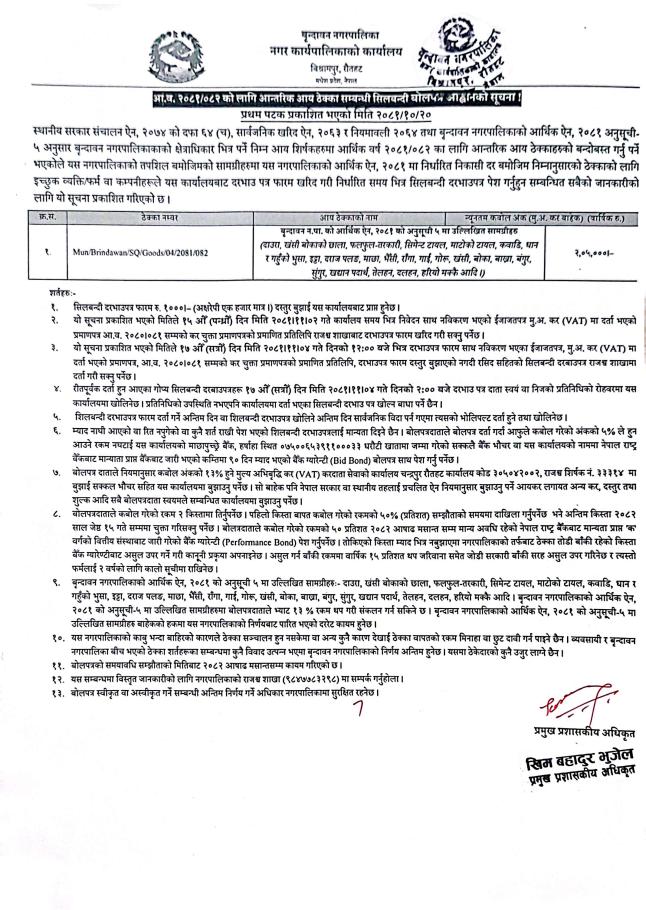 आ.व. २०८१।०८२ को लागि आन्तरिक आय ठेक्का सम्बन्धी शिलबन्दी बोलपत्र आह्वानको सूचना !